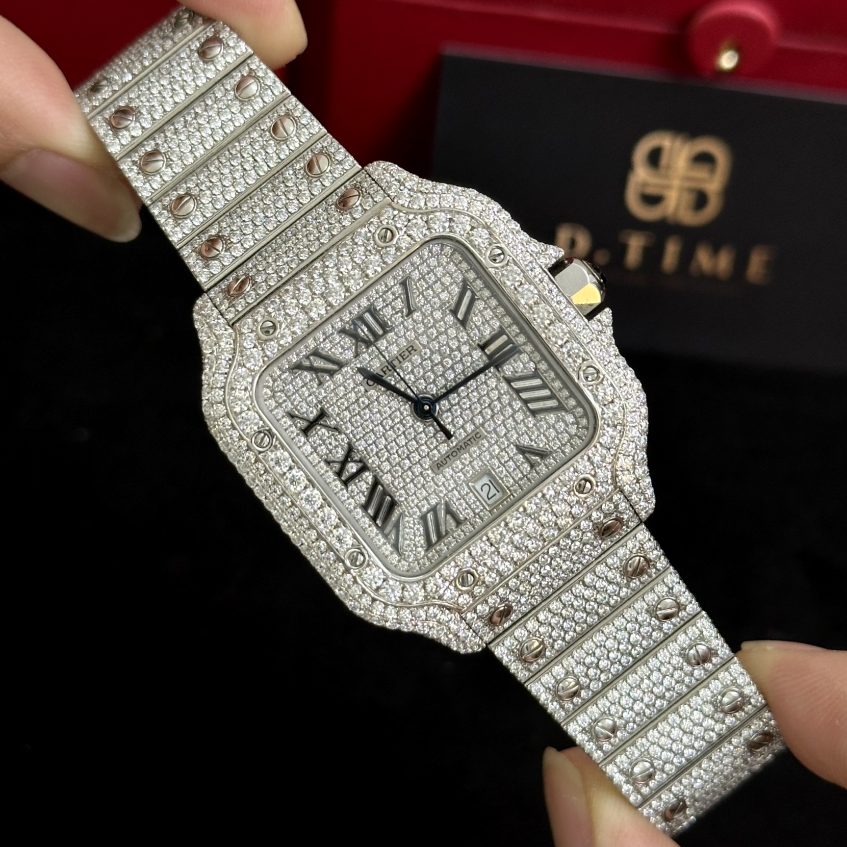 Sự kết hợp giữa thiết kế kinh điển của Cartier Santos size lớn 39.8mm và nghệ thuật đính đá thủ công đã tạo nên một siêu phẩm lấp lánh sang trọng – dành riêng cho những ai theo đuổi sự khác biệt và đẳng cấp. Dựa trên nền tảng phiên bản 1:1 từ BV Factory, mẫu đồng hồ được custom hơn 2000 viên kim Moissanite nước D VVS1, thực hiện hoàn toàn thủ công tại xưởng trang sức Hong Kong.