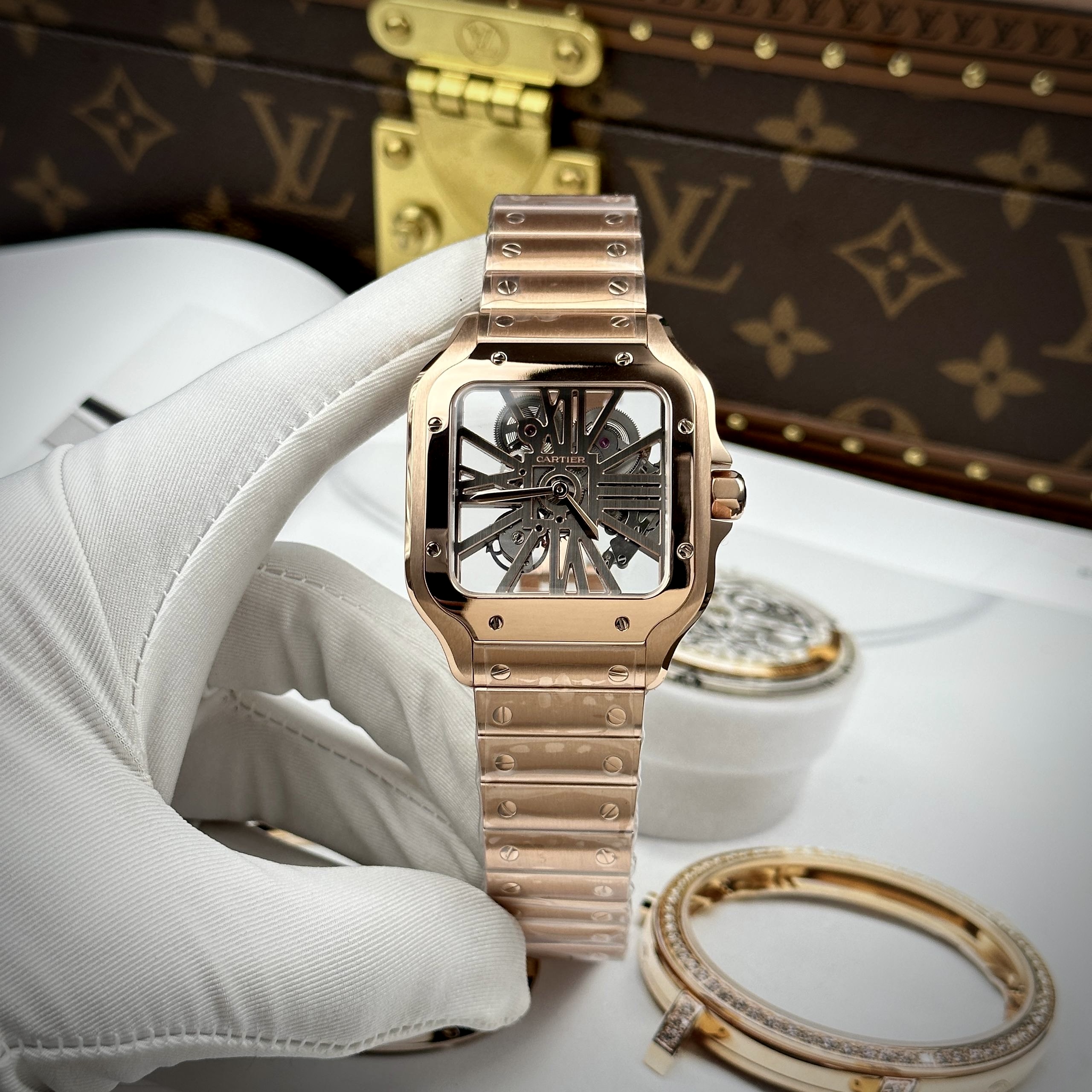 Cartier Santos de Cartier Skeleton WHSA0008 – Nghệ Thuật Cơ Khí Trong Sắc Hồng Ấm Áp