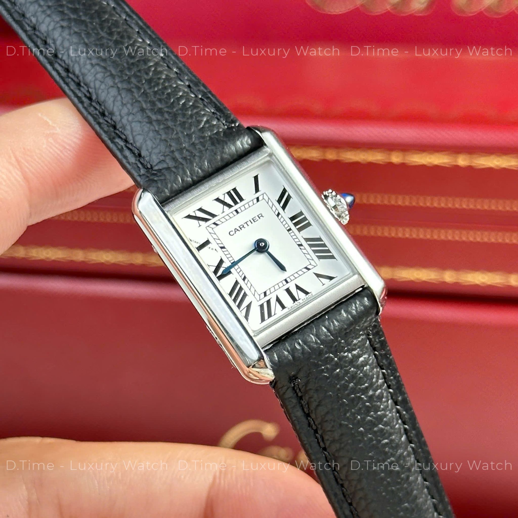 Với kích thước mặt 22mm x 29.5mm, đây là mẫu đồng hồ lý tưởng cho phái nữ hoặc người có cổ tay nhỏ. Hình dáng chữ nhật biểu tượng, mặt số nền trắng với cọc số La Mã xanh lam cổ điển và kim xanh đặc trưng của Cartier – tất cả được tái hiện sắc nét và cân đối theo chuẩn hãng.